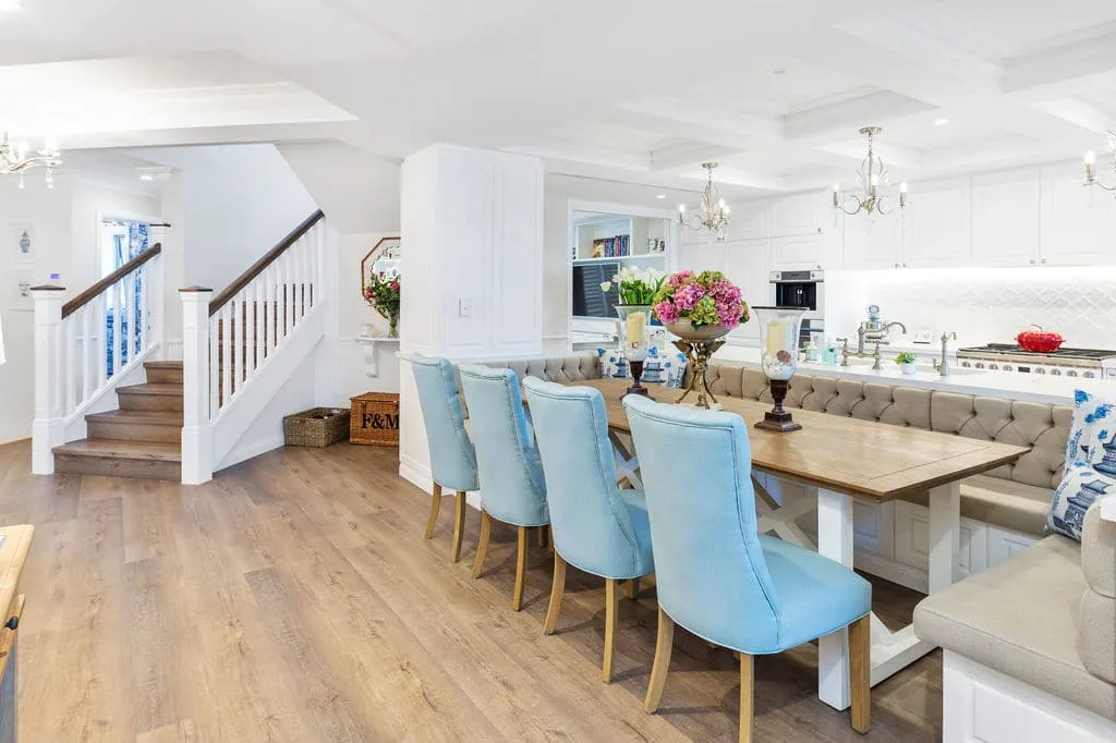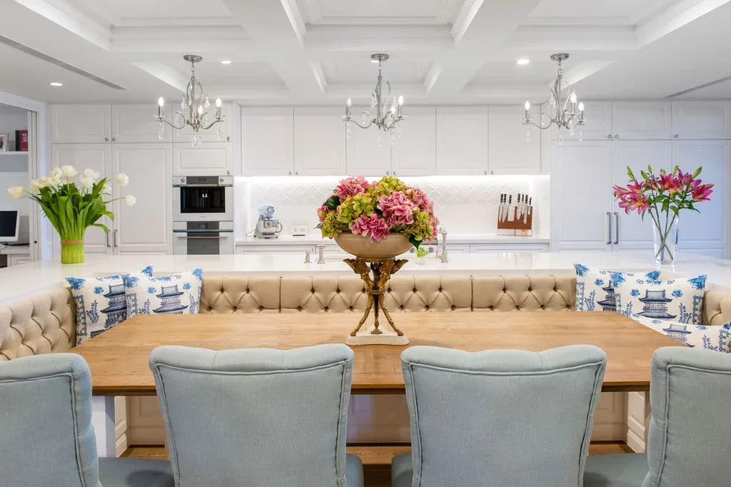 In the hub of the home, the luxurious kitchen had to be functional and practical with loads of storage. The inviting custom-made upholstered banquet seating catered for extended family guests and entertaining while maximising a sense of openness.